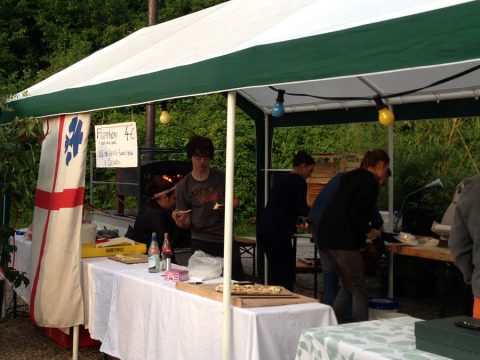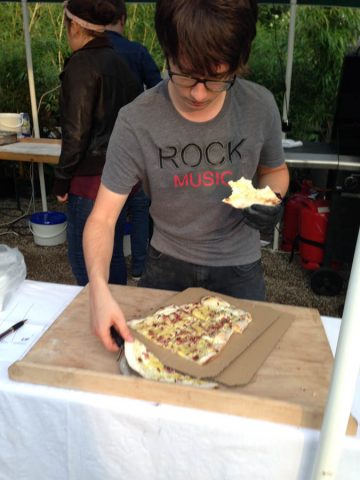 Bei einem Open Air Kino des alte Ziegelei e.V. verkaufen die Rover Flammkuchen, um so Geld für das anstehende Sommerlager an der Ardeche einzunehmen.